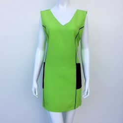 Es una prenda femenina en dos colores con diversas combinaciones (negro-fucsia, negro-naranja, rojo-negro, fucisa-blanco, etc..) Prenda en manga sisa con bolsillos en color combinado con ribete decorativo vertical.
